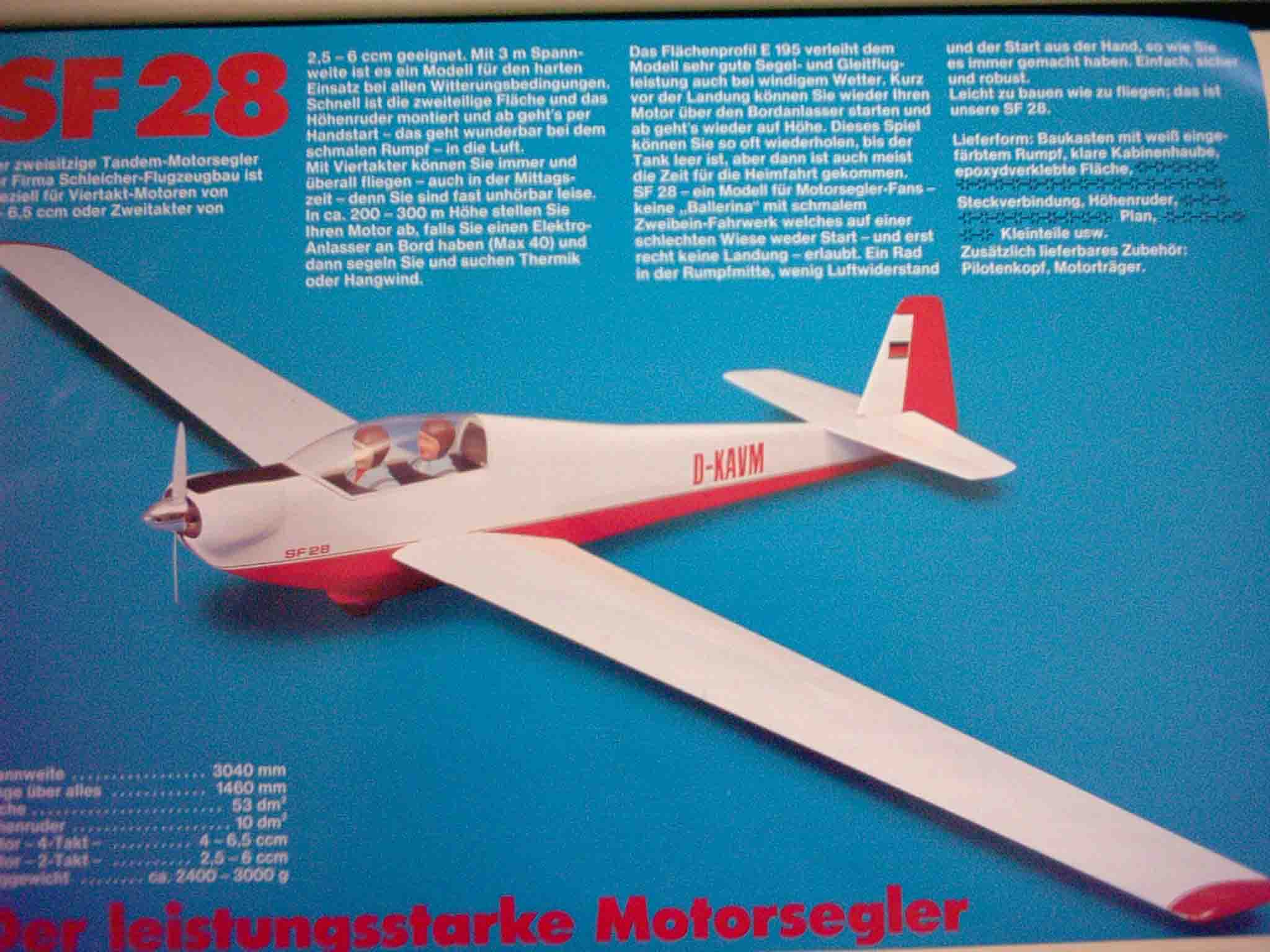 Wollte im Winter 2015/16 einen vorbildgetreuen Motorsegler bauen. Dabei viel meine Wahl auf die SF28 der Fa. Rippin aus Iserlohn. Der Bausatz war insgesamt sehr gut ausgeführt.Der Rumpf war leicht, ohne Lunker,nur eine dünne Naht war zu sehen. Auch die Abachi-beplankten Tragflächen und Leitwerksteile waren einwandtfrei gearbeitet. Da die Flächenhalterung bereits fertig eingebaut war, liegt die Pfeilung der Tragfläche fest. Der Rumpf ist ist wahrscheinlich orginalgetreu).
